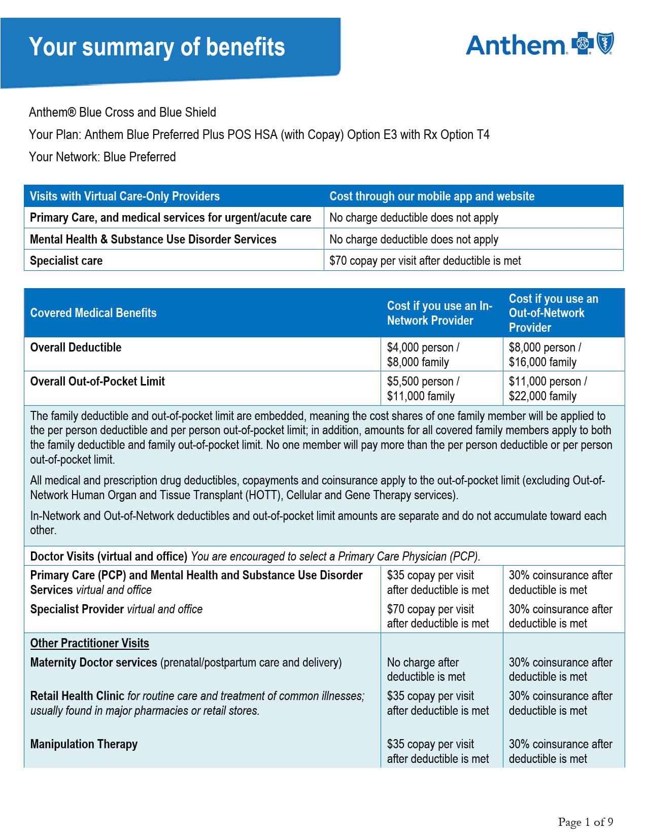 (Option 1B) Anthem Blue Preferred Plus POS $4,000/$8,000 HSA Qualified Plan